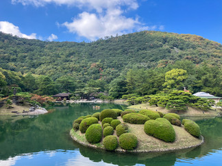 Ritsurin is a large strolling-style landscape garden, built in the Edo period by the local feudal lords. The garden’s 6 ponds and 13 landscaped hills are strategically placed in front of the green vista of Mt. Stiun, and together with the great rock arrangements, bridges and trees make the garden fantastic.